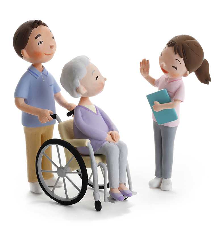 車いすに座った高齢の女性と、彼女を優しく見守り支える二人の介護スタッフが描かれた光景です。高齢者の後ろには、真摯な表情で車いすを押す介護スタッフの男性がおり、パステルピンクの制服を着た介護スタッフの女性が手を振りながら、明るい笑顔で優しくコミュニケーションを取っている心温まる情景です。